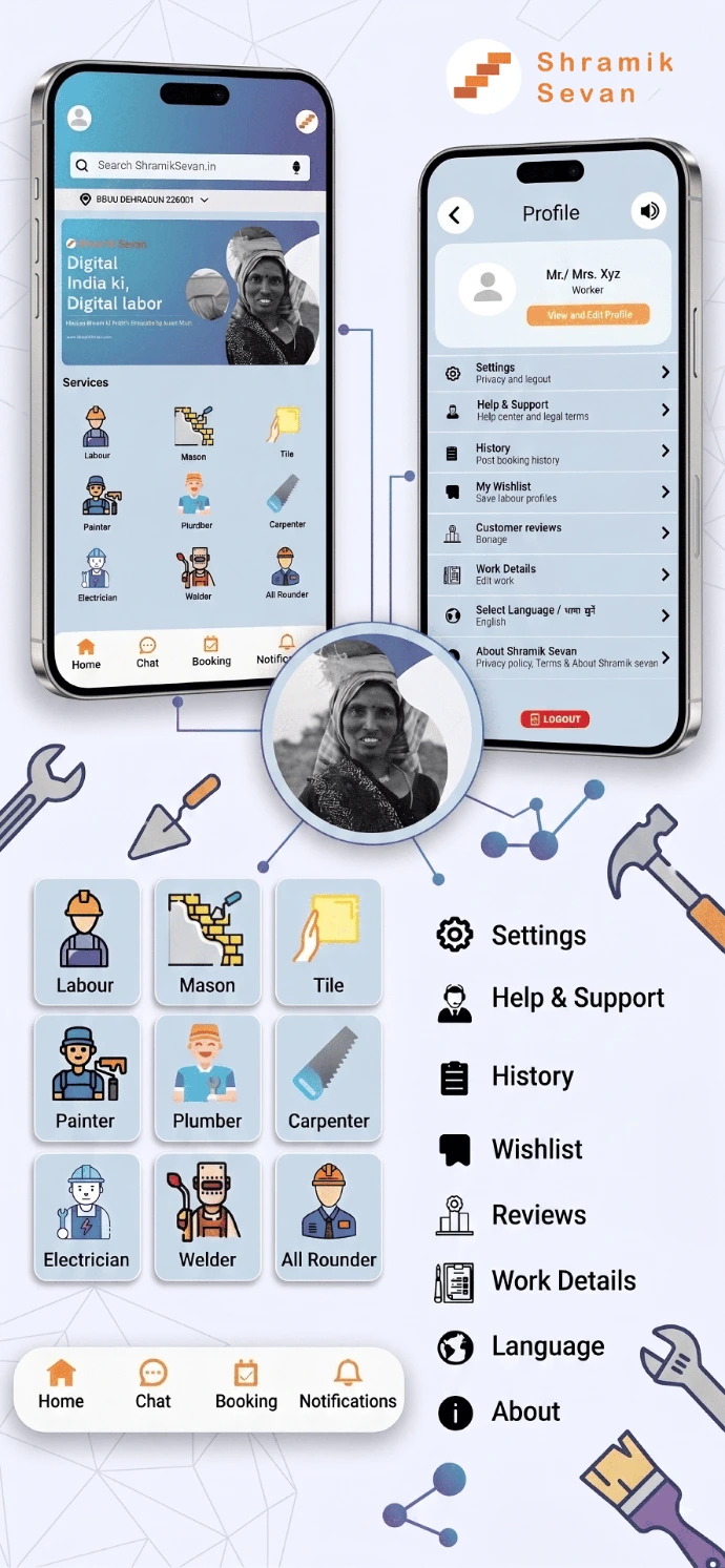 Shramik Sevan is a human-centered digital platform designed to connect customers directly with laborers. The design focuses on accessibility, trust, and simplicity, ensuring usability for users with low digital literacy.